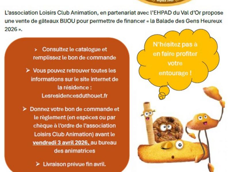 L'association Loisirs Club Animation, en partenariat avec l'EHPAD du Val d'Or, organise une vente de gâteaux "Bijou", du lundi 16 mars au vendredi 3 avril 2026.